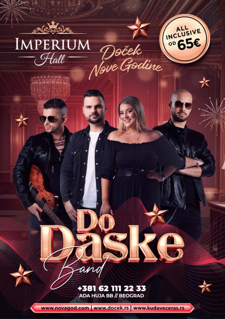 Uživajte u all inclusive piću koje će dodatno obogatiti vašu proslavu, dok se bend “Do daske” pobrine za savršenu atmosferu tokom cele noći. Doček Nove godine 2026. u Imperium Hall-u je prilika da uživate u vrhunskim kulinarskim specijalitetima i nezaboravnim trenucima sa voljenima.